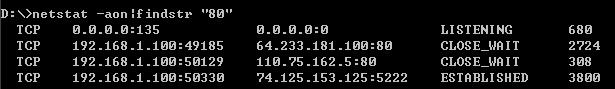Windows上的工具比较多,如Active Ports,如果手头上没有现成的工具可以用命令:netstat -aon|findstr “80”