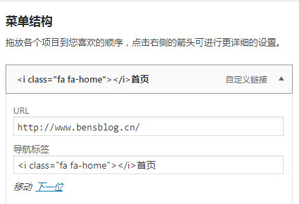 第二步,在导航标签的名称前添加字体图标代码,<i class="fa fa-home"></i>,代码中fa fa-home代表字体图标,更多字体图标可以到font-awesome官网查看,如下图