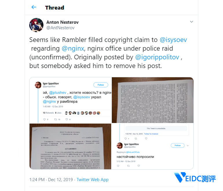 今天,当NGINX员工在Twitter上发布了搜查令的屏幕截图时,有关突袭的消息传遍了各个地方。后来他应俄罗斯警方的要求删除了这条推文。突袭已被其他员工确认。