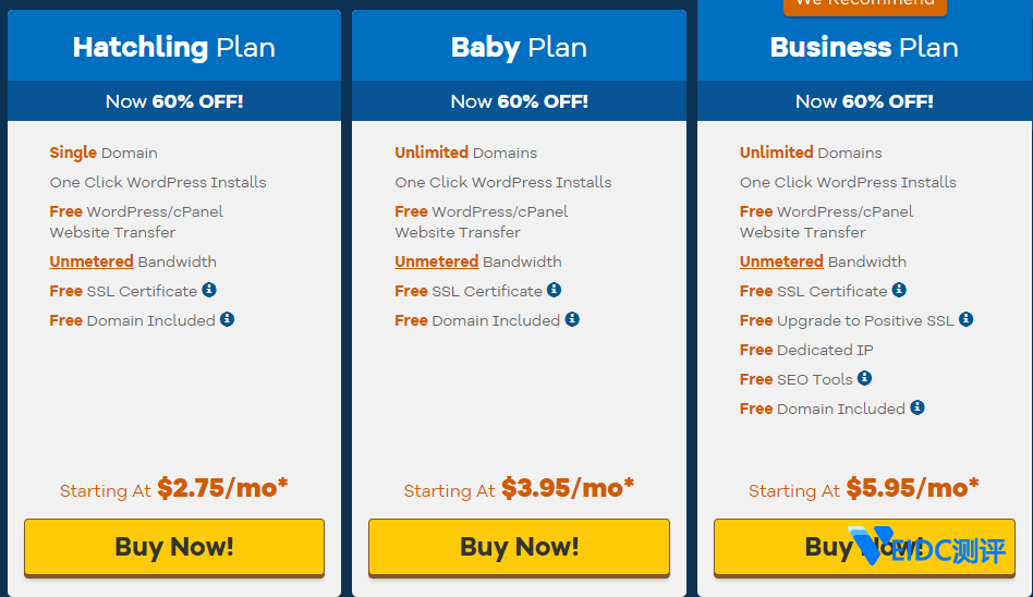 现在HostGator提供三个计划方案,前二个方案更适合个人使用,商用型方案适合企业使用,朋付方案最低只需2.75美元/月。建议购买年付,赠送COM免费域名。
