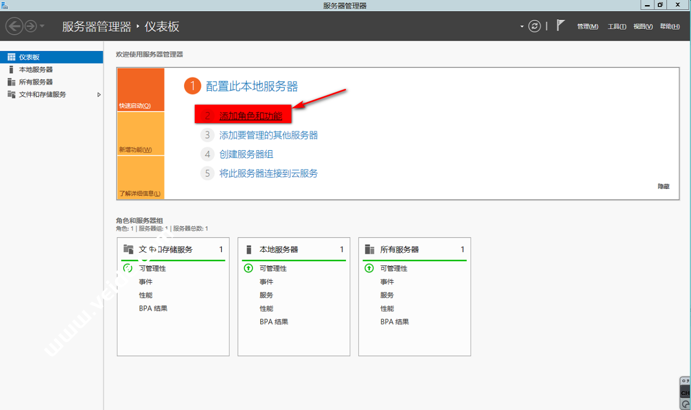 打开”服务器管理器“在”仪表盘“中选择”添加角色和功能“