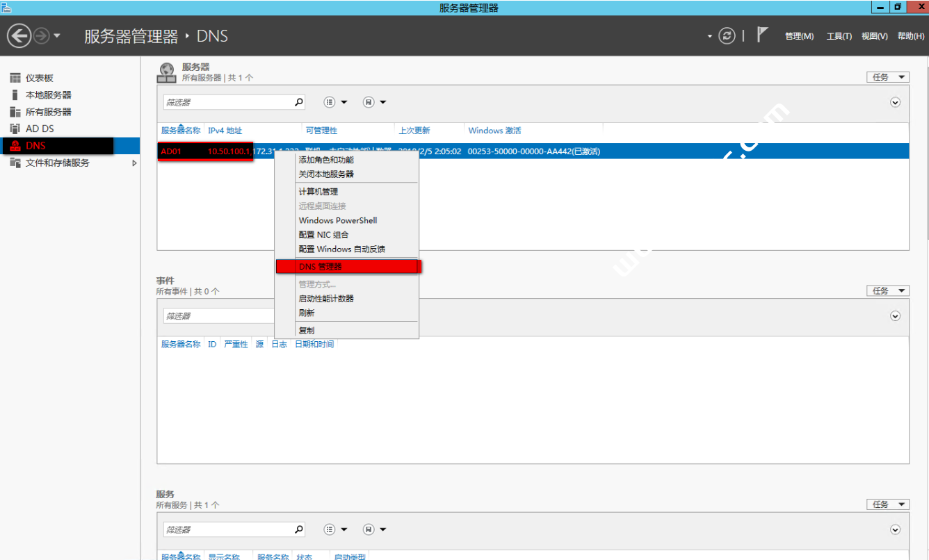 AD02安装结束后会自动重启然后切换到AD01节点上打开“DNS管理器”