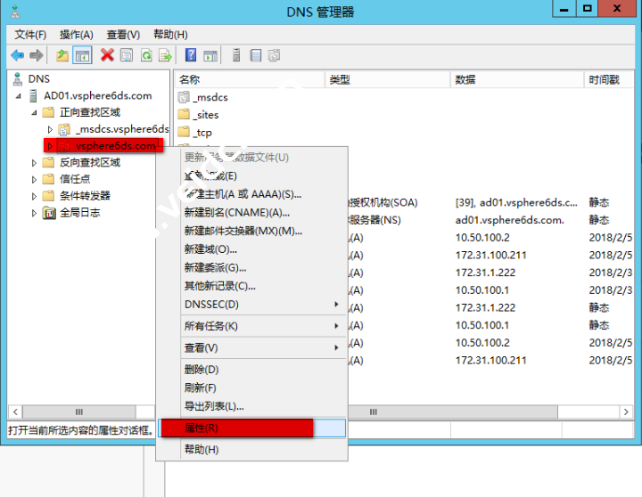 在之前配置的域上右键选择“属性”