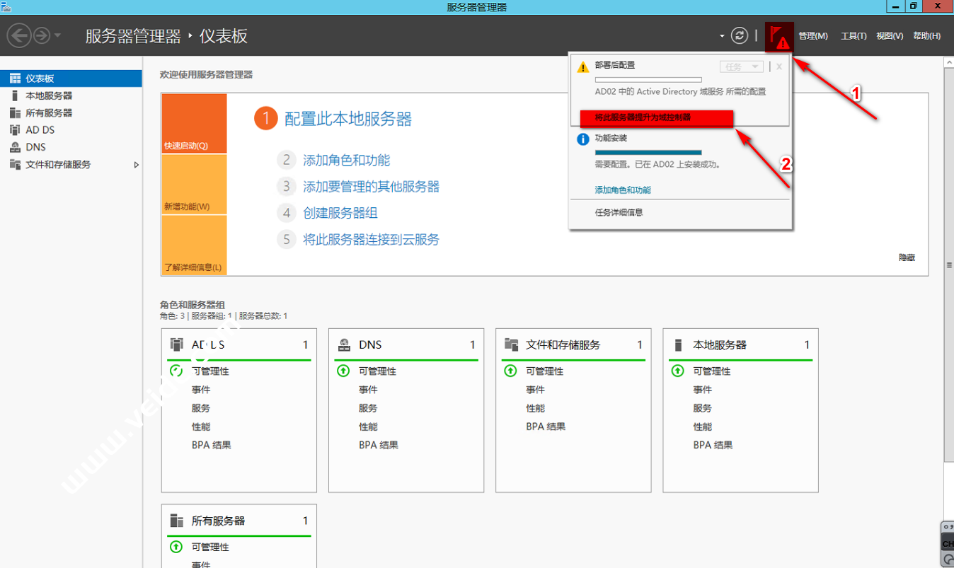 在”服务器管理器“右上的小旗子标签上点击感叹号的小三角,让后在弹出的界面选择”将此服务器提升为域控制器“