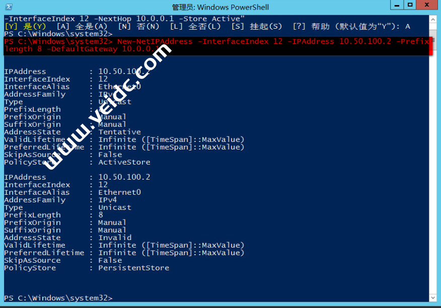 New-NetIPAddress -InterfaceIndex 12 -IPAddress 10.50.100.2 -Prefixlength 8 -DefaultGateway 10.0.0.1