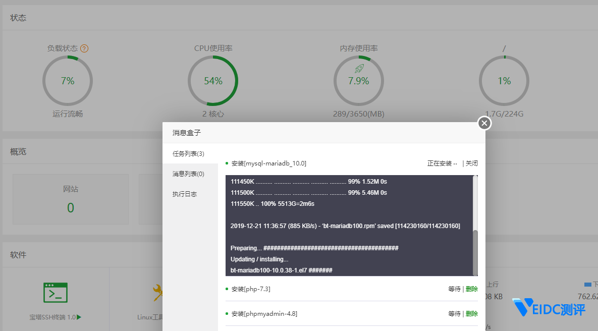 选择快速安装[nginx-1.16]+[mysql-mariadb_10.0]+php-7.3+phpmyadmin-4.8,速度还不错,花了12分钟。比一般的云主机还快,资源使用也是一片绿,很多VPS和云主机安装可能全红,CPU和内存爆满。