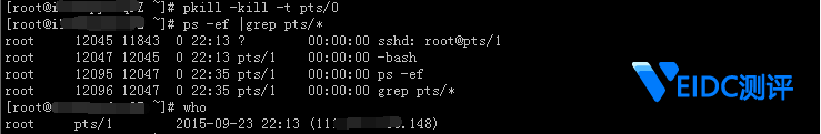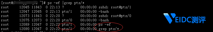 2.如果通过 IP 无法确定,则可以执行 ps -ef |grep pts/ 显示终端进行的操作信息,这时查看终端 pts/1 显示执行的命令是 ps -ef 与 grep pts/ 与自己的操作吻合,说明 pts/1 是自己的登录终端。