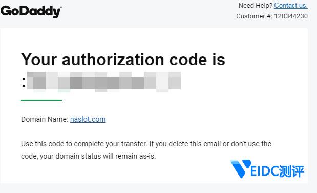 3、从邮箱中获得你的域名转出授权码,注意下面的授权码包括冒号。