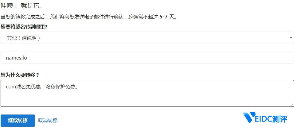 2、填写域名转出信息,确认转出后转移授权码会发送到你的邮箱中。