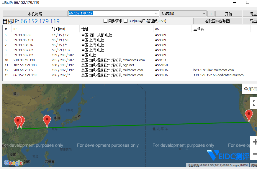 ---------------------------------------------------------------------- CPU model : Intel(R) Xeon(R) CPU E5-2670 0 @ 2.60GHz Number of cores : 3 CPU frequency : 2599.998 MHz Total amount of Mem : 1998 MB Total amount of Swap : 2047 MB System uptime : 0days, 0:1:34 Virtualization : kvm IPaddr : 美国 加利福尼亚州 洛杉矶 multacom.com ---------------------------------------------------------------------- I/O speed(1st run) : 71.5 MB/s I/O speed(2nd run) : 317 MB/s I/O speed(3rd run) : 343 MB/s Average I/O speed : 243.833 MB/s ---------------------------------------------------------------------- Hosted by Spectrum (Monterey Park, CA) [27.32 km]: 2.221 ms 上传 : 656.60 Mbit/s 下载 : 488.17 Mbit/s ---------------------------------------------------------------------- Node Name Upload Speed Download Speed Latency 上海 电信 5.49 Mbit/s 11.74 Mbit/s 170.191 ms 杭州 电信 0.00 Mbit/s 0.00 Mbit/s 1800000.0 ms 西安 联通 15.70 Mbit/s 40.28 Mbit/s 289.992 ms 广东 移动 12.44 Mbit/s 41.74 Mbit/s 161.228 ms ---------------------------------------------------------------------- Node Name IPv4 address Download Speed CacheFly 205.234.175.175 88.0MB/s Linode, Tokyo, JP 139.162.65.37 3.70MB/s Linode, Singapore, SG 139.162.23.4 2.78MB/s Linode, London, UK 176.58.107.39 2.12MB/s Linode, Frankfurt, DE 139.162.130.8 1.82MB/s Linode, Fremont, CA 50.116.14.9 27.7MB/s Softlayer, Dallas, TX 173.192.68.18 33.0MB/s Softlayer, Seattle, WA 67.228.112.250 41.7MB/s Softlayer, Frankfurt, DE 159.122.69.4 2.86MB/s Softlayer, Singapore, SG 119.81.28.170 7.89MB/s Softlayer, HongKong, CN 119.81.130.170 8.62MB/s ---------------------------------------------------------------------- ===测试 [上海电信(天翼云)] 到这台服务器的路由=== 1 * N/A * 2 10.100.111.254 局域网 1.3 / 0.9 / 1.1 3 101.227.255.33 上海 电信 5.2 / 0.8 / 2.2 4 * N/A * 5 124.74.166.17 上海 电信 2.7 / 2.6 / 2.6 6 202.101.63.214 上海 电信 2 / 5.2 / 2.4 7 59.43.80.13 上海 电信 3.3 8 * N/A * 9 59.43.187.74 上海 电信 16.8 10 59.43.182.82 中国 电信 152.6 11 218.30.49.130 美国加利福尼亚州洛杉矶 ctamericas.com 147.2 / 143.6 / 143.6 12 * N/A * 13 * N/A * 14 119.179.152.66-dedicated.multacom.com美国加利福尼亚州洛杉矶 multacom.com 145.1 ===测试 [杭州联通] 到这台服务器的路由=== 1 * N/A * 2 * N/A * 3 172.31.111.229 局域网 1.7 / 1.8 / 2.3 4 * N/A * 5 124.160.128.33 浙江杭州 联通 3.7 / 3.3 / 3.3 6 219.158.5.241 上海 联通 9.4 / 15.7 / 9.4 7 219.158.113.114 上海 联通 13.5 / 11 / 8.5 8 219.158.113.133 上海 联通 10.6 / 16 / 13.6 9 219.158.116.238 美国加利福尼亚州圣何塞 联通 151.9 / 157.4 / 155 10 63.146.27.85 美国加利福尼亚州圣何塞 centurylink.com 147.3 11 67.14.102.146 美国加利福尼亚州洛杉矶 centurylink.com 160.7 / 160.7 / 160.6 12 65.153.29.222 美国加利福尼亚州洛杉矶 centurylink.com 168.1 / 168.8 / 169.8 13 * N/A * 14 * N/A * ===测试 [四川德阳移动] 到这台服务器的路由=== 1 117.174.59.1 四川德阳 移动 2.3 / 2.9 / 3.3 2 112.18.212.90 四川德阳 移动 1.4 / 1.3 / 1.3 3 112.18.212.89 四川德阳 移动 1.4 / 1.4 / 1.3 4 223.87.25.17 四川成都 移动 1.9 / 1.9 / 1.9 5 * N/A * 6 221.183.19.45 四川成都 移动 1.9 / 1.9 / 1.9 7 221.183.9.145 北京 移动 35.8 / 48.8 / 35.8 8 221.176.27.254 北京 移动 36.7 / 37 / 36.7 9 221.183.46.249 北京 移动 37.9 / 37.6 / 37.9 10 221.183.30.246 北京 移动 233 / 224.9 / 230.2 11 223.118.10.154 美国加利福尼亚州洛杉矶 移动 212.2 / 211.9 / 431.1 12 38.19.140.57 美国加利福尼亚州洛杉矶 cogentco.com 295.8 / 331 / 320.2 13 * N/A * 14 38.99.219.58 美国加利福尼亚州洛杉矶 cogentco.com 494.8 / 209.1 / 210.6 15 72.44.66.202 美国加利福尼亚州洛杉矶 multacom.com 209.1 / 209.2 / 209.2 16 66.152.179.119 美国加利福尼亚州洛杉矶 multacom.com 228.3 / 222.4 / 232.6 ---------------------------------------------------------------------- ===测试 [广州电信(天翼云)] 的回程路由=== Start: Thu Dec 26 16:11:19 2019 HOST: racknerd-b212c4 Loss% Snt Last Avg Best Wrst StDev 1.|-- 43.226.26.1 0.0% 10 0.4 19.4 0.4 118.1 36.0 2.|-- be4-1.asr2.lax.multacom.c 0.0% 10 2.3 1.4 0.8 2.3 0.0 3.|-- 182.54.129.88 0.0% 10 16.2 2.5 0.6 16.2 4.8 4.|-- 218.30.54.189 0.0% 10 7.2 4.7 1.5 8.7 2.5 5.|-- 202.97.72.101 0.0% 10 152.5 155.3 152.4 156.3 1.5 6.|-- 202.97.91.138 0.0% 10 161.6 169.9 161.6 175.2 5.0 7.|-- 202.97.91.97 0.0% 10 165.8 169.5 156.9 177.1 6.8 8.|-- 183.61.221.53 10.0% 10 170.5 168.4 157.7 173.5 5.0 9.|-- 183.56.128.6 0.0% 10 171.2 170.3 159.8 174.1 4.5 10.|-- 14.215.116.1 0.0% 10 172.2 173.9 162.1 207.8 12.5 ===测试 [上海电信(天翼云)] 的回程路由=== Start: Thu Dec 26 16:11:36 2019 HOST: racknerd-b212c4 Loss% Snt Last Avg Best Wrst StDev 1.|-- 43.226.26.1 0.0% 10 0.5 5.1 0.4 18.5 6.2 2.|-- be4-1.asr2.lax.multacom.c 0.0% 10 0.8 1.6 0.8 2.4 0.3 3.|-- 182.54.129.88 0.0% 10 0.6 0.9 0.6 1.8 0.0 4.|-- 218.30.53.189 0.0% 10 4.3 4.3 1.4 7.0 2.0 5.|-- 202.97.70.129 0.0% 10 138.6 138.7 135.5 141.3 2.2 6.|-- 202.97.74.2 10.0% 10 150.4 150.4 148.8 152.2 1.1 7.|-- 202.97.24.177 30.0% 10 150.2 150.0 148.7 151.2 0.7 8.|-- 61.152.24.17 20.0% 10 153.2 153.9 150.5 157.5 2.4 9.|-- ??? 100.0 10 0.0 0.0 0.0 0.0 0.0 ===测试 [厦门电信CN2] 的回程路由=== Start: Thu Dec 26 16:11:57 2019 HOST: racknerd-b212c4 Loss% Snt Last Avg Best Wrst StDev 1.|-- 43.226.26.1 0.0% 10 0.5 3.3 0.4 23.3 7.1 2.|-- be4-1.asr2.lax.multacom.c 0.0% 10 0.9 1.8 0.9 4.2 0.8 3.|-- ae-41.a00.lsanca07.us.bb. 0.0% 10 1.1 1.5 0.6 4.7 1.2 4.|-- ae-11.r00.lsanca07.us.bb. 0.0% 10 99.3 99.3 99.1 99.5 0.0 5.|-- ae-2.r23.lsanca07.us.bb.g 0.0% 10 1.0 0.9 0.8 1.4 0.0 6.|-- ae-12.r31.tokyjp05.jp.bb. 0.0% 10 110.2 110.4 110.0 112.5 0.6 7.|-- ae-3.r00.tokyjp08.jp.bb.g 0.0% 10 110.9 110.9 110.7 111.0 0.0 8.|-- ae-1.a00.tokyjp04.jp.bb.g 0.0% 10 104.9 106.9 104.6 119.9 4.8 9.|-- xe-0-0-12-1.a00.tokyjp04. 0.0% 10 109.3 109.2 109.1 109.3 0.0 10.|-- 59.43.1