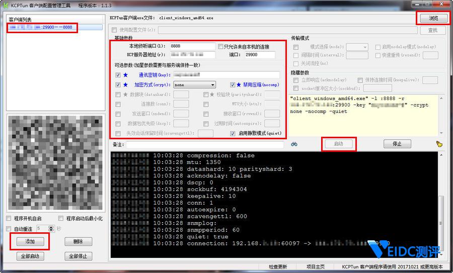 4.各参数设置完成后,点击启动按钮,开始连接KCPTUN服务器端。下方的黑色窗口会显示连接状态。