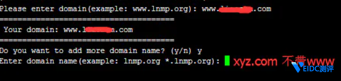 是否添加更多的域名,输入 y,回车。在上一步中我们添加了带 www 的域名,这里再添加一个不带 www 的域名。为了后面方便做 301跳转用的。