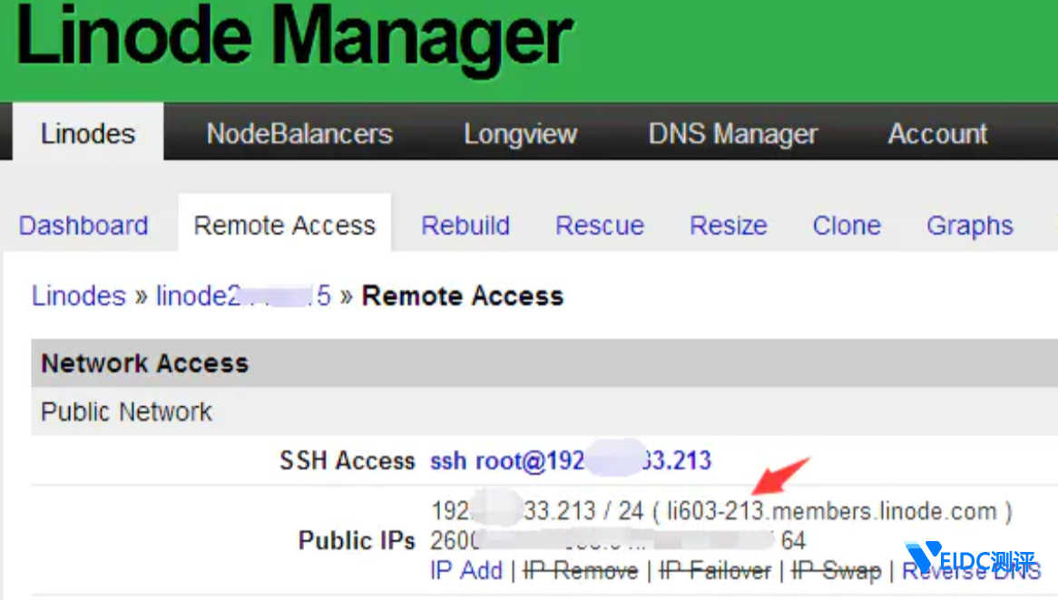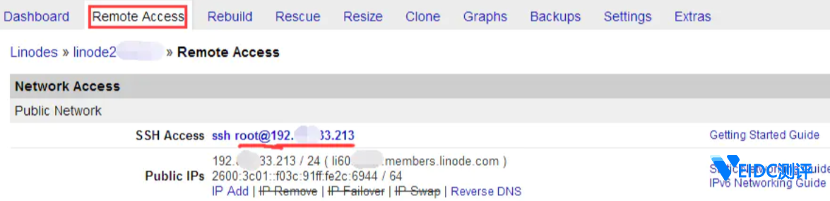 上面截图中,红色划线部分是你要记住的。详细解释一下:服务器 192.xx.xxx.213 上有个用户名为 root 的账号。其实很简单,记住用户名是 root(一般都是这个,管理员root)和你的 VPS服务器的 IP 地址就行了。不记得也没有关系,点击 Linodes,在你的服务器列表中也更清楚地有显示你的 VPS IP地址。
