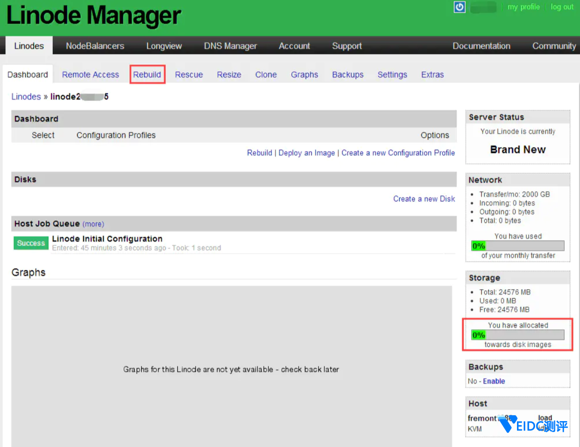 然后点击 Rebuild,系统会自动配置并跳转到如下页面。当你看到这个页面,基本上你的 VPS 的硬盘挂载和 Linux系统就配置好了。