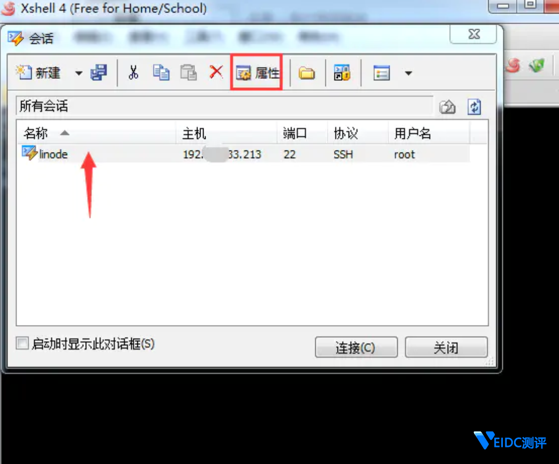 可以看到已经有了一个名称为 Linode 的会话。此时可以鼠标双击,Xshell 就会开始进行会话连接。(如果你之前的 VPS IP或者是密码填写错了,还可以鼠标单击选中某个会话然后点击上面的属性进行修改)此时开始连接,如果连接成功命令行会有提示: