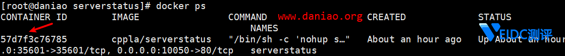 docker run -d --restart=always --name=serverstatus -v ~/serverstatus/config.json:/ServerStatus/server/config.json -p 10050:80 -p 35601:35601 cppla/serverstatus