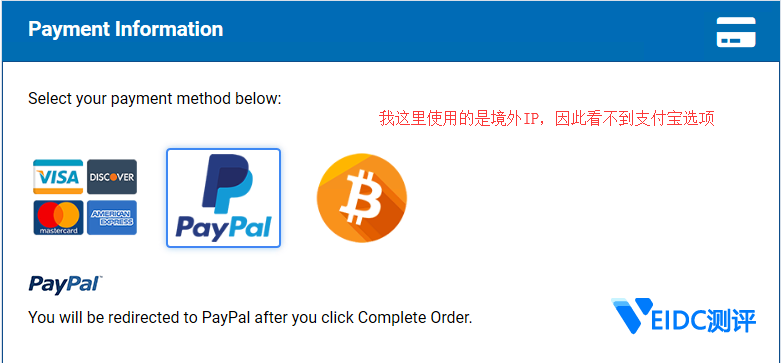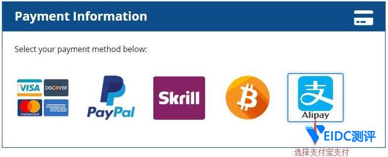 7、然后选择付款方式,一般我们选择支付宝进行付款 (只有国内 IP 访问的时候才有支付宝付款方式),如下图所示: