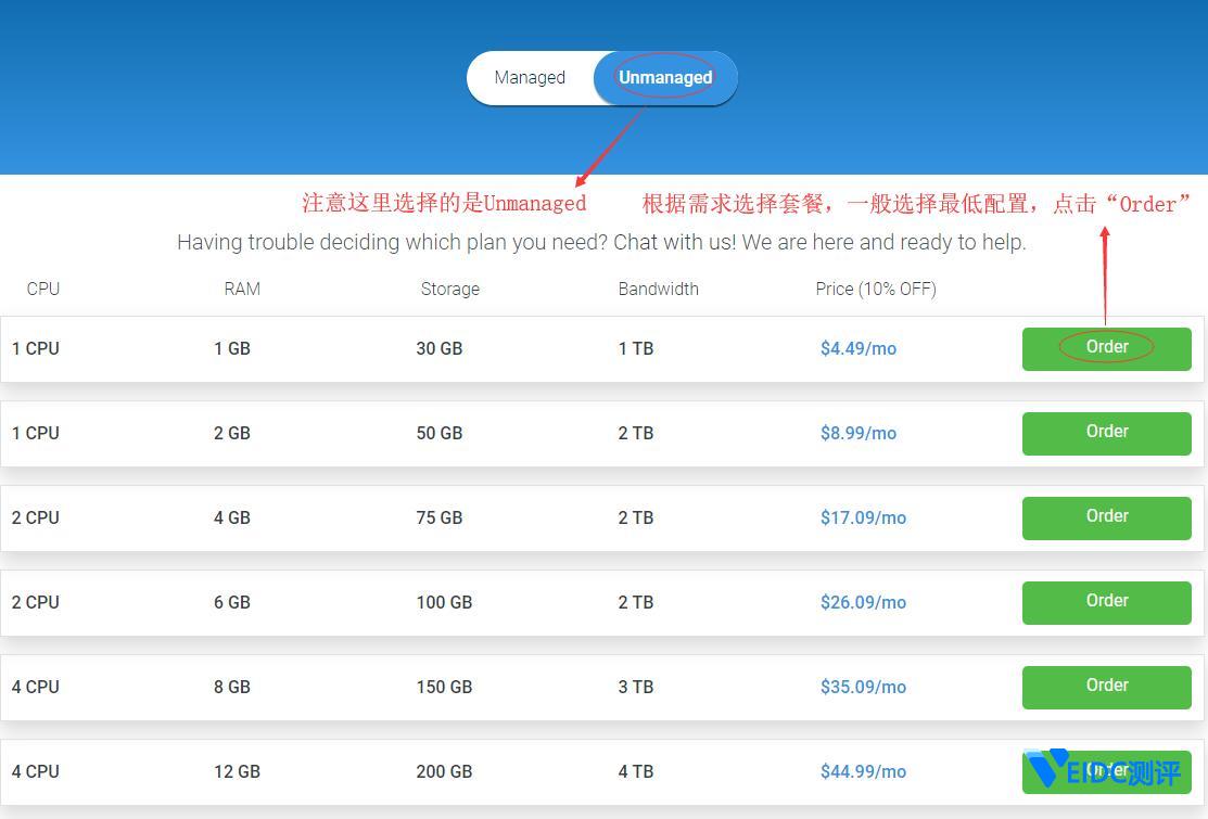 2、进入 VPS 选择页面后,根据自己的需要的配置选择套餐,一般我们选择最低配置就够用了,然后点击 “Order” 按钮进入信息填写页面,如下所示: