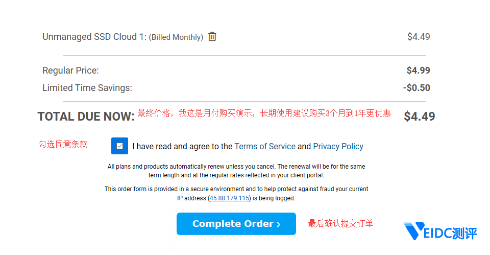 8、最后确认价格(不同时期可能价格有些许不同,如果通过前面优惠链接点击购买会有优惠),勾选同意协议,然后点击“Complete Order”按钮进行下单, 如下图所示: