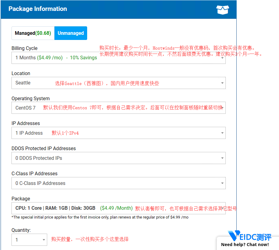 1、通过 Hostwinds 优惠链接进入Hostwinds 首页,选择 “VPS” 下的 “Unmanaged VPS” ,这是最便宜的Linux VPS方案。(注意千万不要选择页面上 3.29 美元那个,那个是虚拟主机,不是 VPS !!!)**。