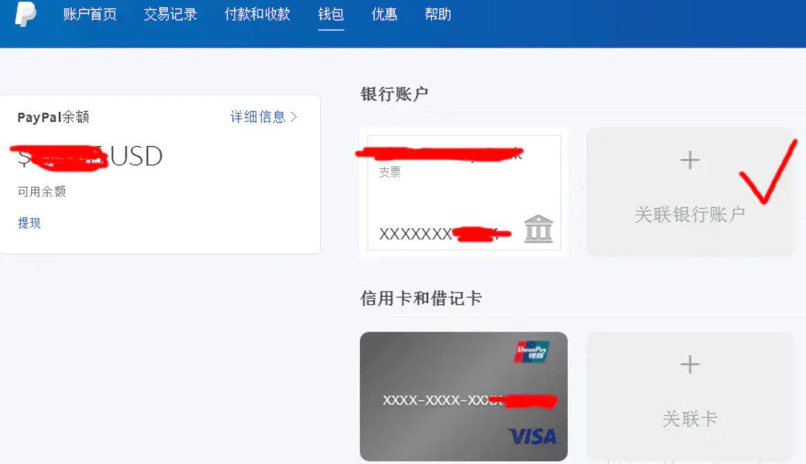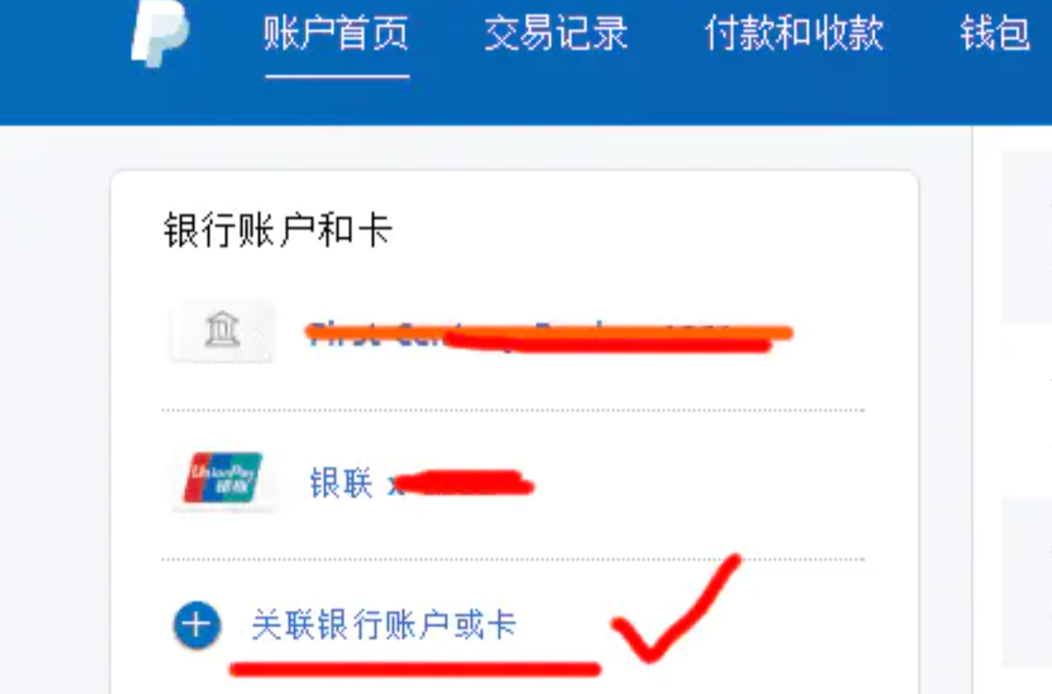 1. 登录您的paypal 账户,在账户首页选项中找到银行账户和卡,点击“关联银行账户或卡”: