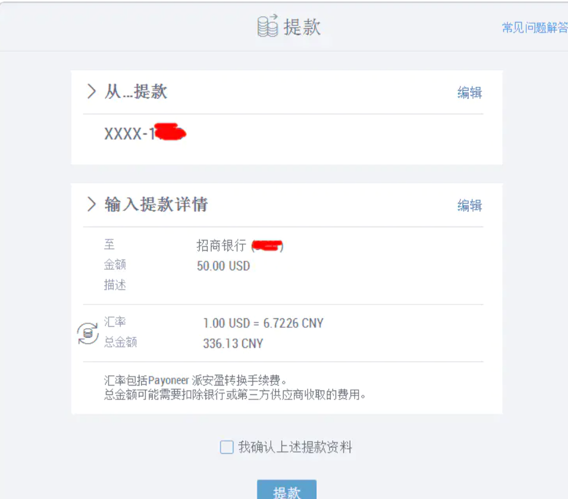 7.确定所有内容正确无误之后,选中复选框 “我确认上述提款资料”并点击 “提款”。