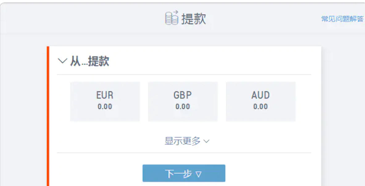 B. 输入您希望提取的金额。请注意您的可用余额,该余额显示在页面顶部。