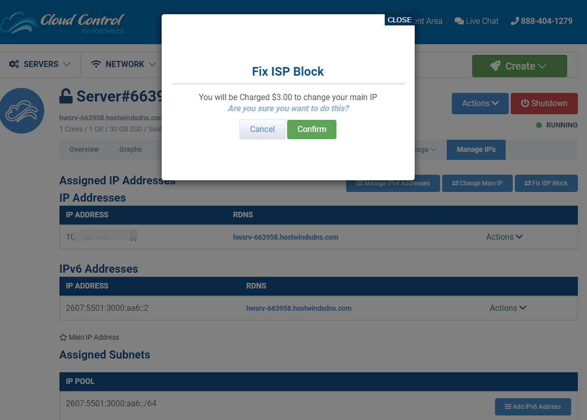 Fix ISP Block也和Change Main IP一样收费3USD一次更换IP。可能最近国内墙得太历害,因此Hostwinds官方暂时不提供免费更换方式。本站将持续关注。网友如有最新情况可以反馈给我们。(2020年2月15日更新)