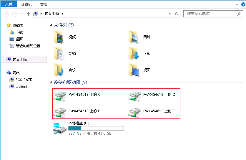 - 查看Windows云服务器的磁盘信息,如果有显示本地主机的磁盘设备,则表示您的本地主机与Windows云服务器之间可以互传数据了,如图5所示。