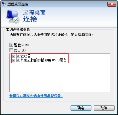 - 勾选“驱动器”和“其他支持的即插即用(PnP)设备”,并单击“确定”,将本地主机上的所有磁盘映射到Windows云服务器。