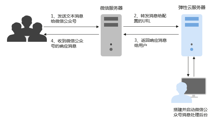 在本教程中,您将学会使用VPS云服务器搭建微信公众号处理后台,使用Python语言编写对应的微信消息处理逻辑代码,接收从微信服务端转发过来的消息,并返回处理结果给最终用户,如图1所示。