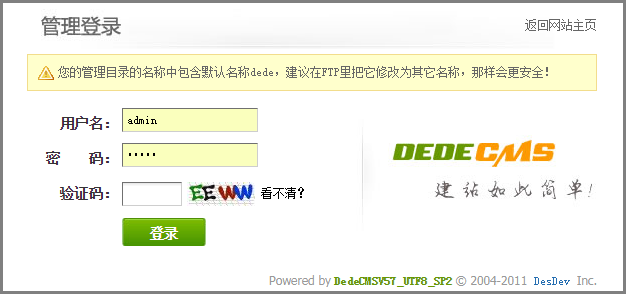 - 通过浏览器访问“www.test.com/dede”,进入网站后台管理登录界面。