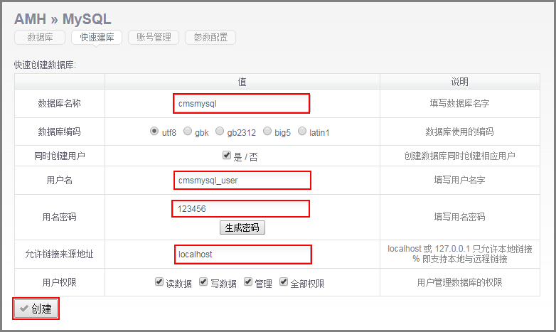 - 填写数据库信息,单击“创建”。