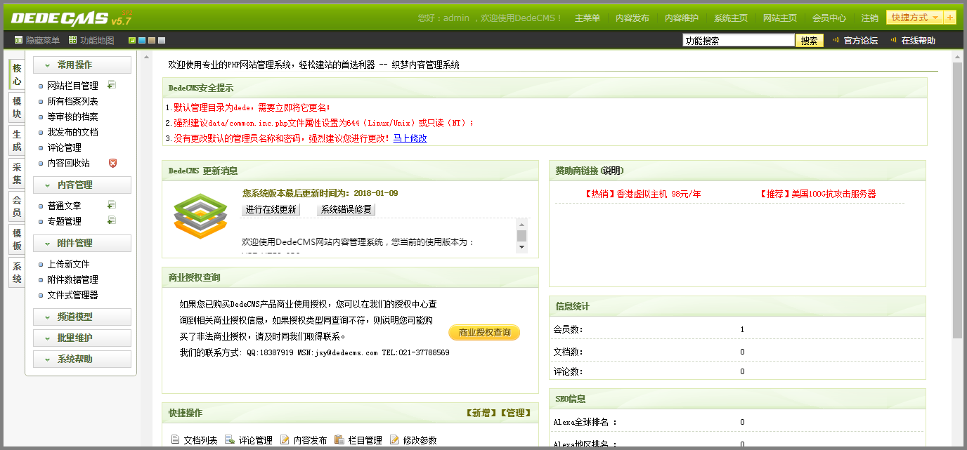 - 输入管理员用户名、密码和验证码,单击“登录”,进入网站后台管理界面。