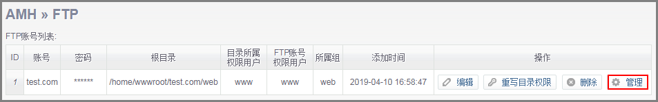 - 选择新增的FTP账号,单击“管理”。