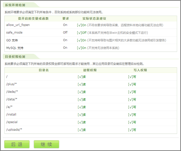 - 单击“继续”,进行环境检测。