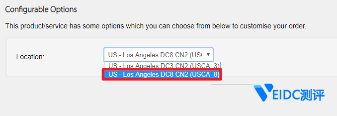 目前我们在网站后台迁移机房的地方,已经可以看到机房名称作出了改变,如下图所示,变成了 US: Los Angeles, California (DC8 ZNET) [USCA_8],去掉了 CN2 字样。