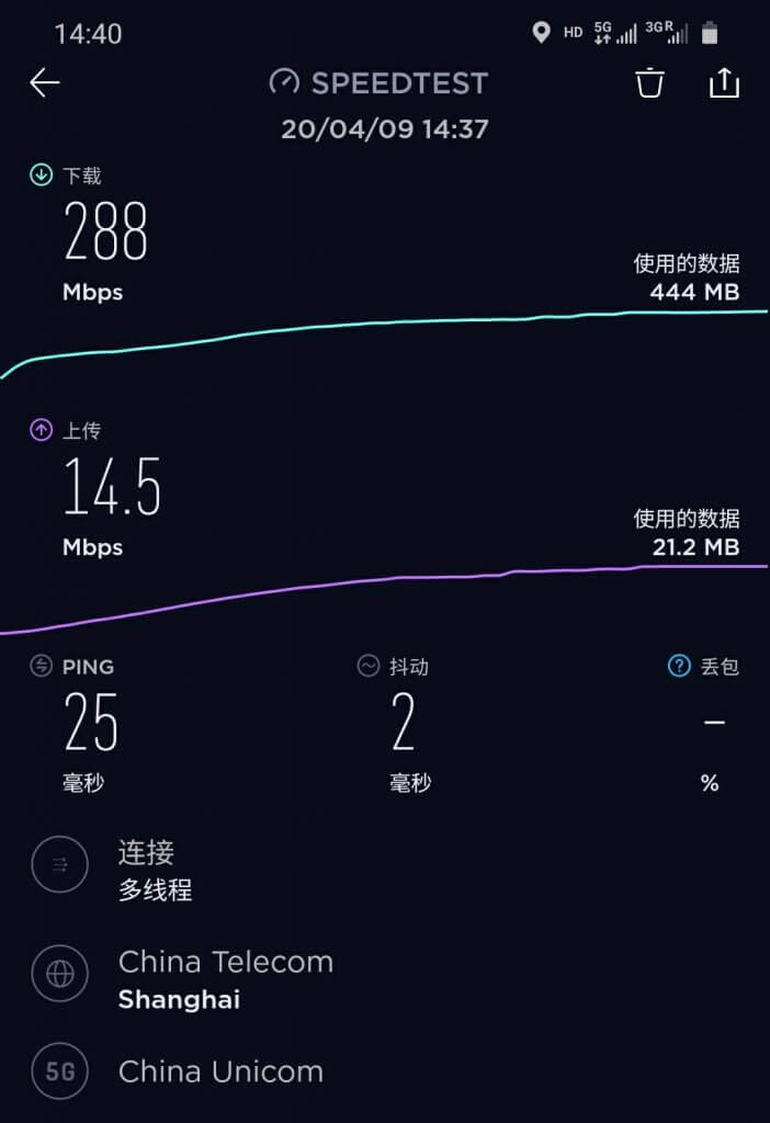此外,我们如果是使用手机,也可以在应用商店下载 Speedtest 客户端进行测速。比如下面是本站用手机测速的结果。