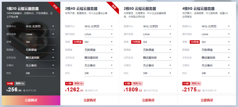 | 云耀云服务器 | 2核心 | 4GB | 40GB | 5Mbps | 无限流量 | 1个 | ¥1262/3年 | 点击购买 |