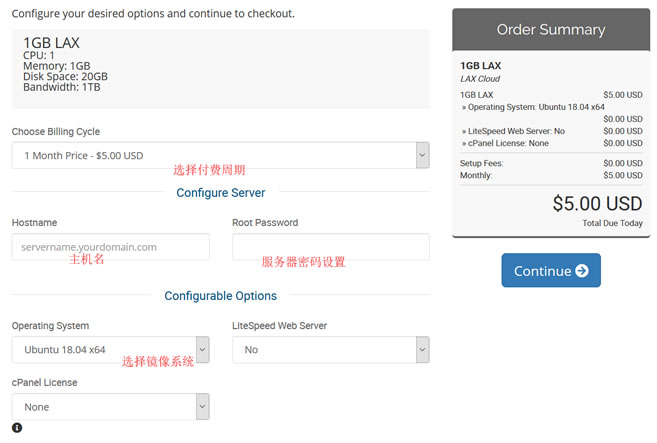 我们可以看到有多个数据中心可选,相对来说洛杉矶是比较普遍的。起步配置是1GB内存、1TB流量,月付五美元起步,起步配置都还算可以,后面配置价格就没有多少竞争力。