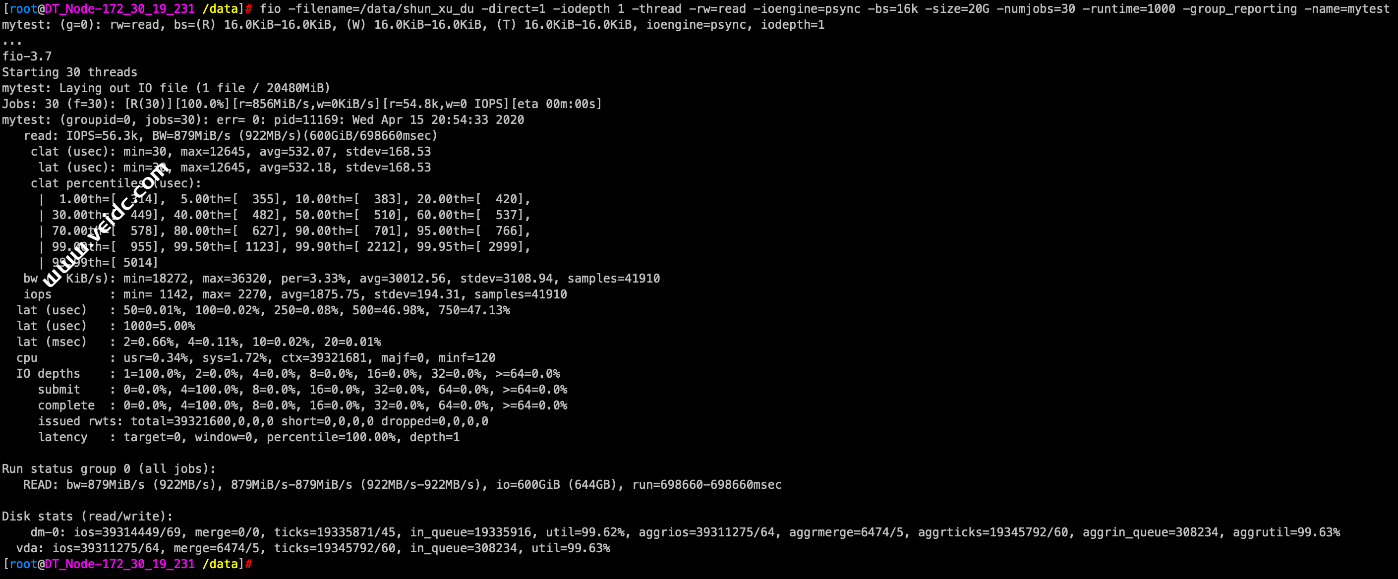 [root@DT_Node-172_30_19_231 /data]# fio -filename=/data/shun_xu_du -direct=1 -iodepth 1 -thread -rw=read -ioengine=psync -bs=16k -size=20G -numjobs=30 -runtime=1000 -group_reporting -name=mytest