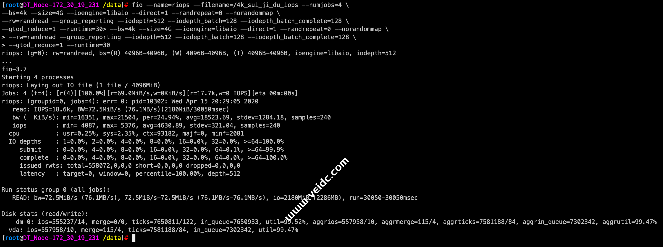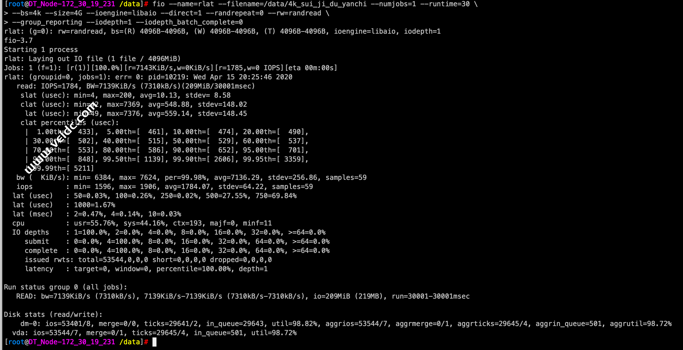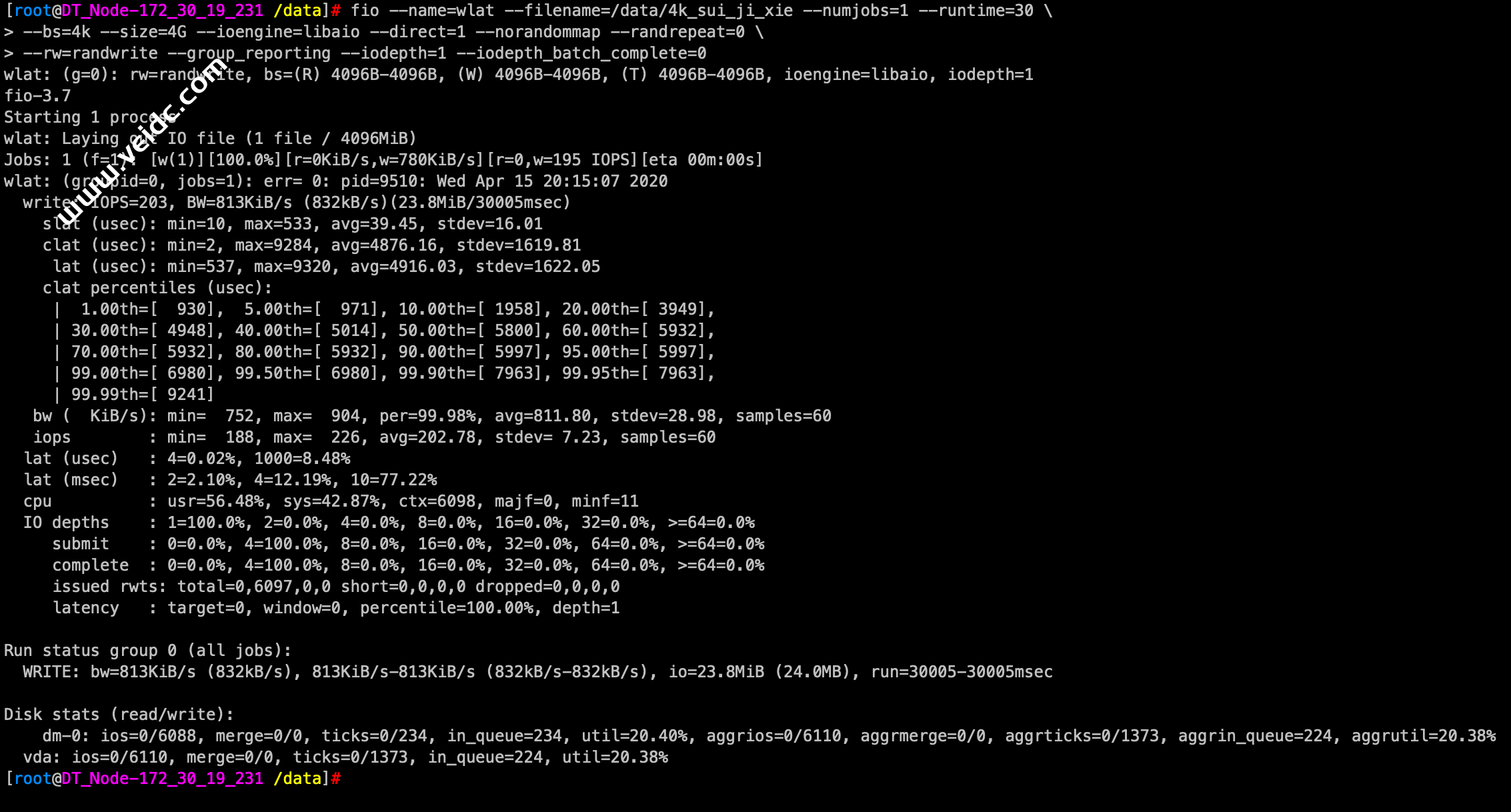 [root@DT_Node-172_30_19_231 /data]# fio --name=wlat --filename=/data/4k_sui_ji_xie --numjobs=1 --runtime=30 \