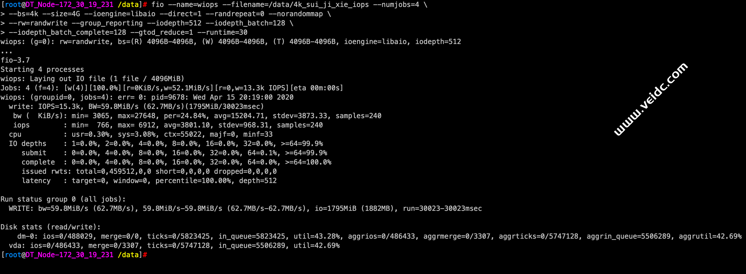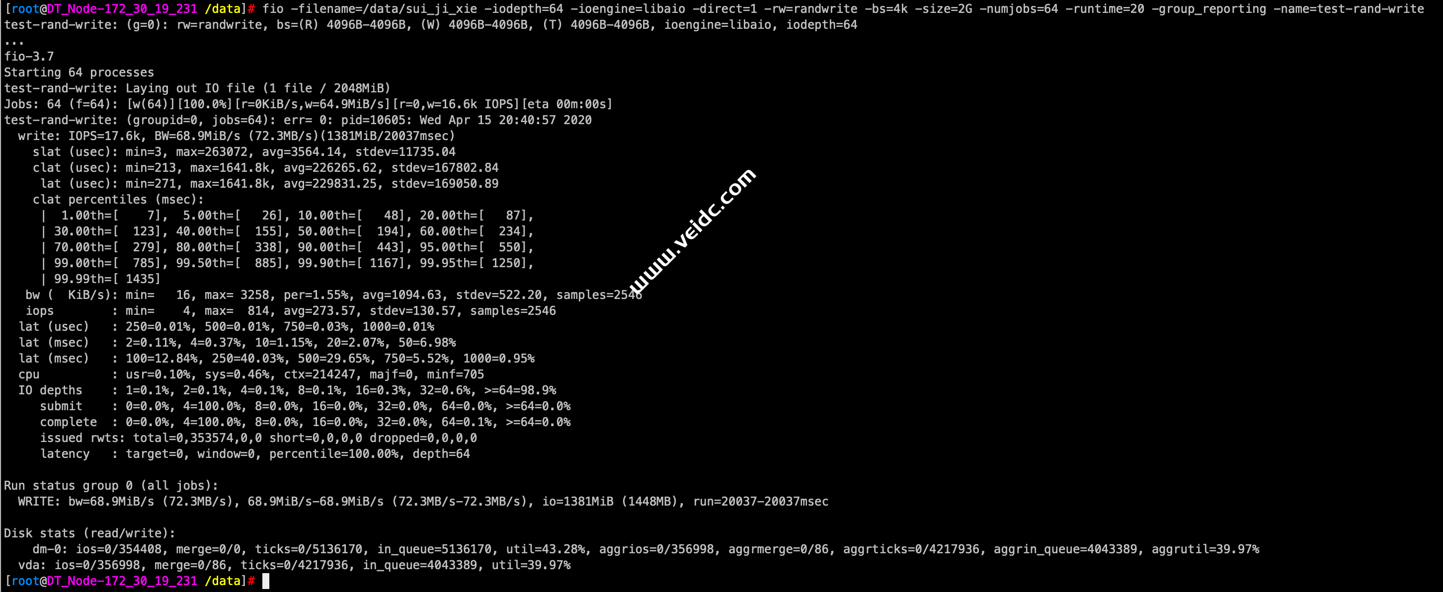 [root@DT_Node-172_30_19_231 /data]# fio -filename=/data/sui_ji_xie -iodepth=64 -ioengine=libaio -direct=1 -rw=randwrite -bs=4k -size=2G -numjobs=64 -runtime=20 -group_reporting -name=test-rand-write
