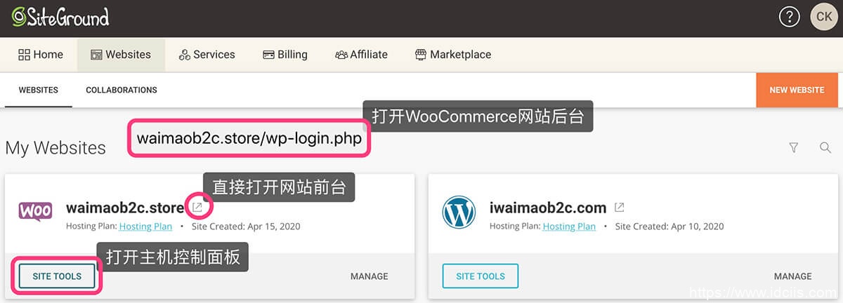 接下来就跟着我们的WooCommerce教程一起来申请 CloudFlare 的免费CDN服务,首先进入到SiteGround的后台,然后在网站列表页面点击Site Tools进入到网站的主机控制面板中心。