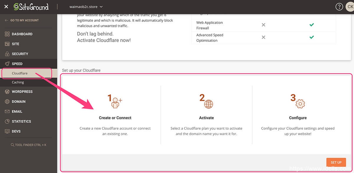 点击上图右下角的SET UP按钮,在弹窗中选择CREATE NEW选项用来创建Cloudflare账户,如果你已经在Cloudflare官网创建了账户,可以选择Connect Existing选项绑定你的Siteground账户和Cloudflare账户。