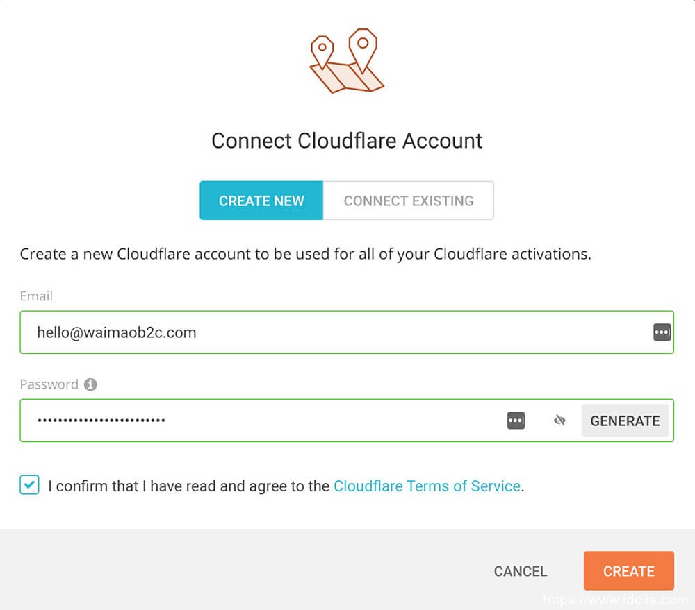 注册新的Cloudflare账户,输入你要注册账户的邮箱地址和密码,勾选上Cloudflare服务条款,然后点击右下角的CREATE按钮即可。