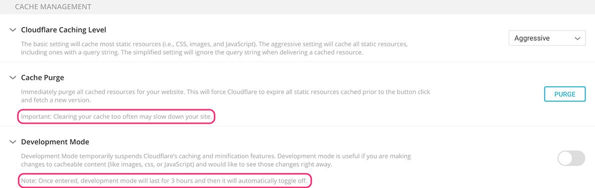 Development Mode 实际上是暂时停用CloudFlare的服务,当你对网站做一些修改,想要修改立即显示到网站前台的时候,那么你可以先启用“开发者模式”,就可以实时看到修改的效果。开发者模式会在三个小时之后自动关闭。