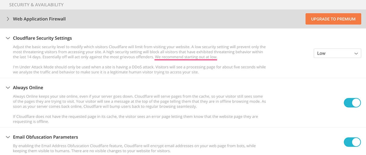 Cloudflare Security Settings 按照Cloudflare的建议,初期选择 Low就可以。Cloudflare会依据第三方提供的IP信誉数据来决定该IP地址访问网站的时候是否显示人机验证功能来保护你的网站,太高的等级可能会给你的网站访客增加额外的负担。后期你可以按照你的网站流量质量,来随时调整安全等级。
