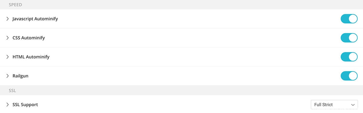 这个没什么说的,SPEED选项中的JS,CSS,HTML,以及Railgun全部启用就可以了。SSL证书支持选择 Full Strict,前提条件是你已经按照我们的申请和安装SSL证书教程给你的WooCommerce网站安装好了SSL证书。