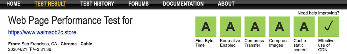 你可以使用Webpagetest测试下你的网站的打开速度,例如 waimaob2c.store这个网站在Webpagetest的测试结果如下图所示:其中的Effective use of CDN为绿色背景的对勾,是说Webpagetest检测到这个网站目前在使用CDN服务来加速网站的打开速度。